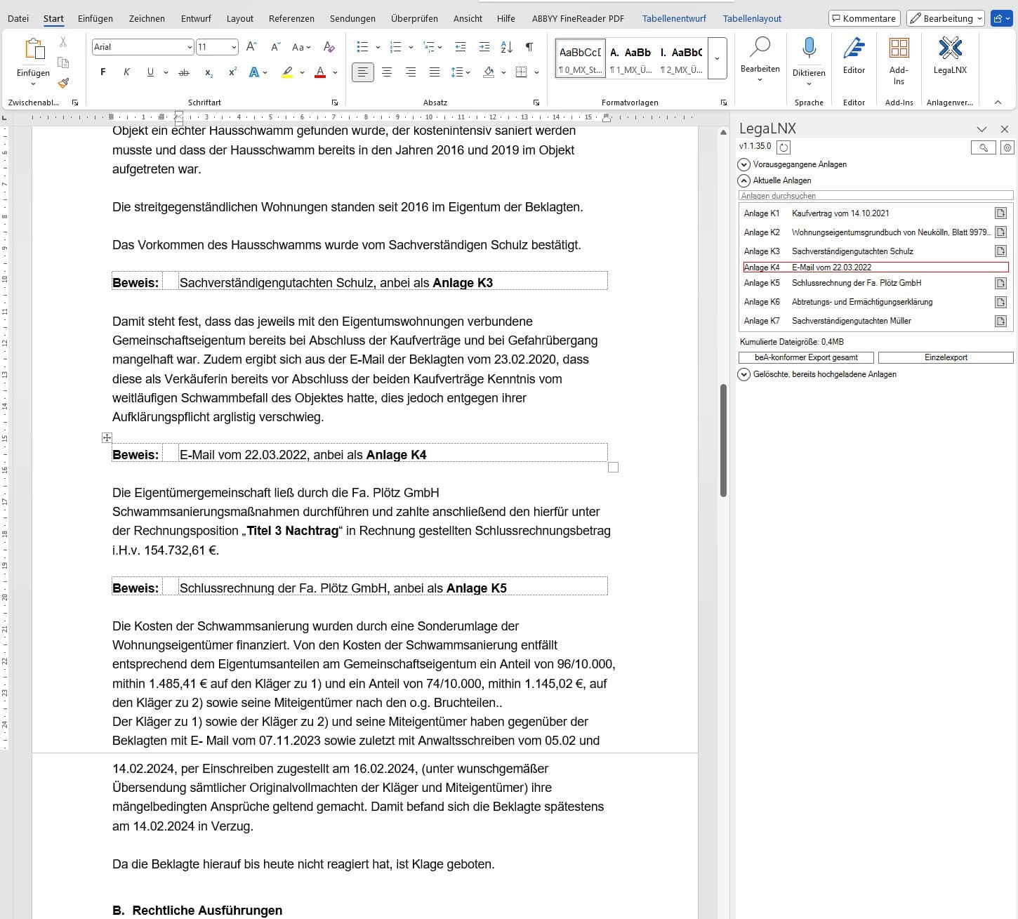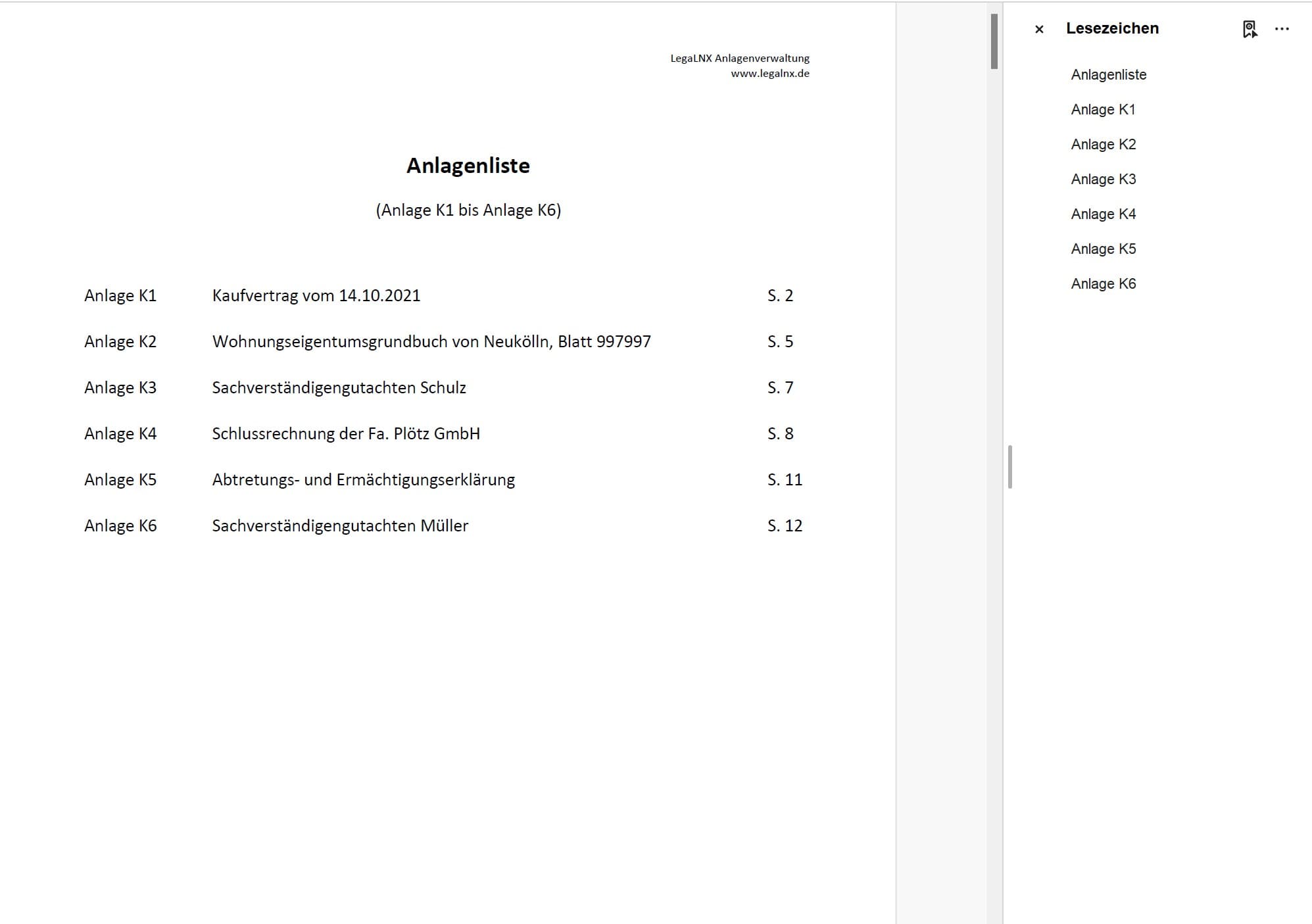 Ja, mit LegaLNX können Sie die Anlagen passgenau als PDF mit Stempeln und Anlagenverzeichnis exportieren.