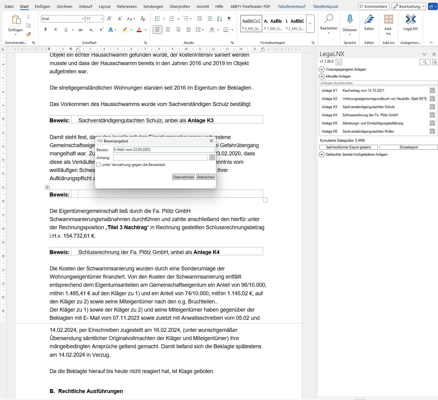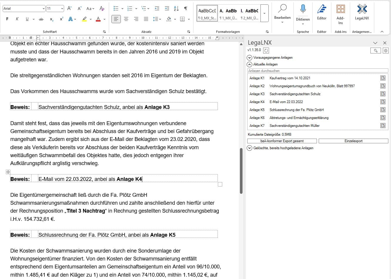 Ja, LegaLNX ermöglicht die direkte Verknüpfung der Anlagendokumente mit den Anlagenverweisen im Text.