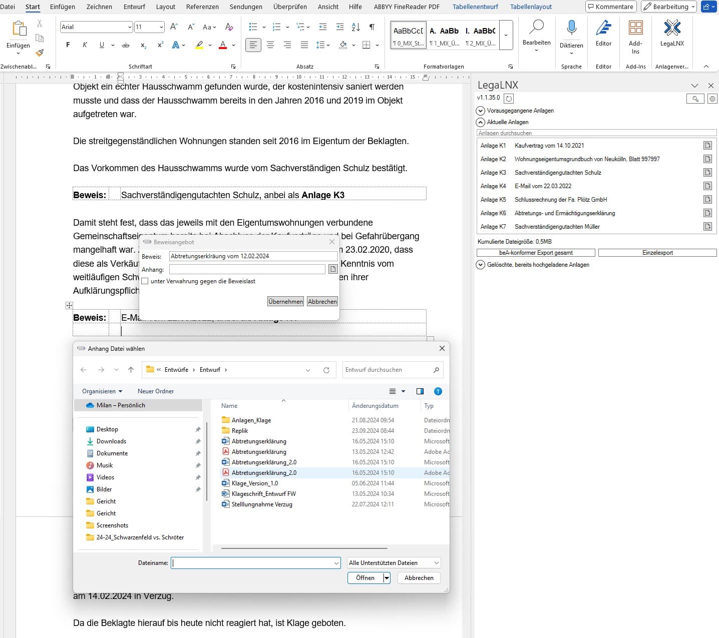 Automatisierte Anlagenverwaltung bei der Erstellung von Schriftsätzen und Verträgen